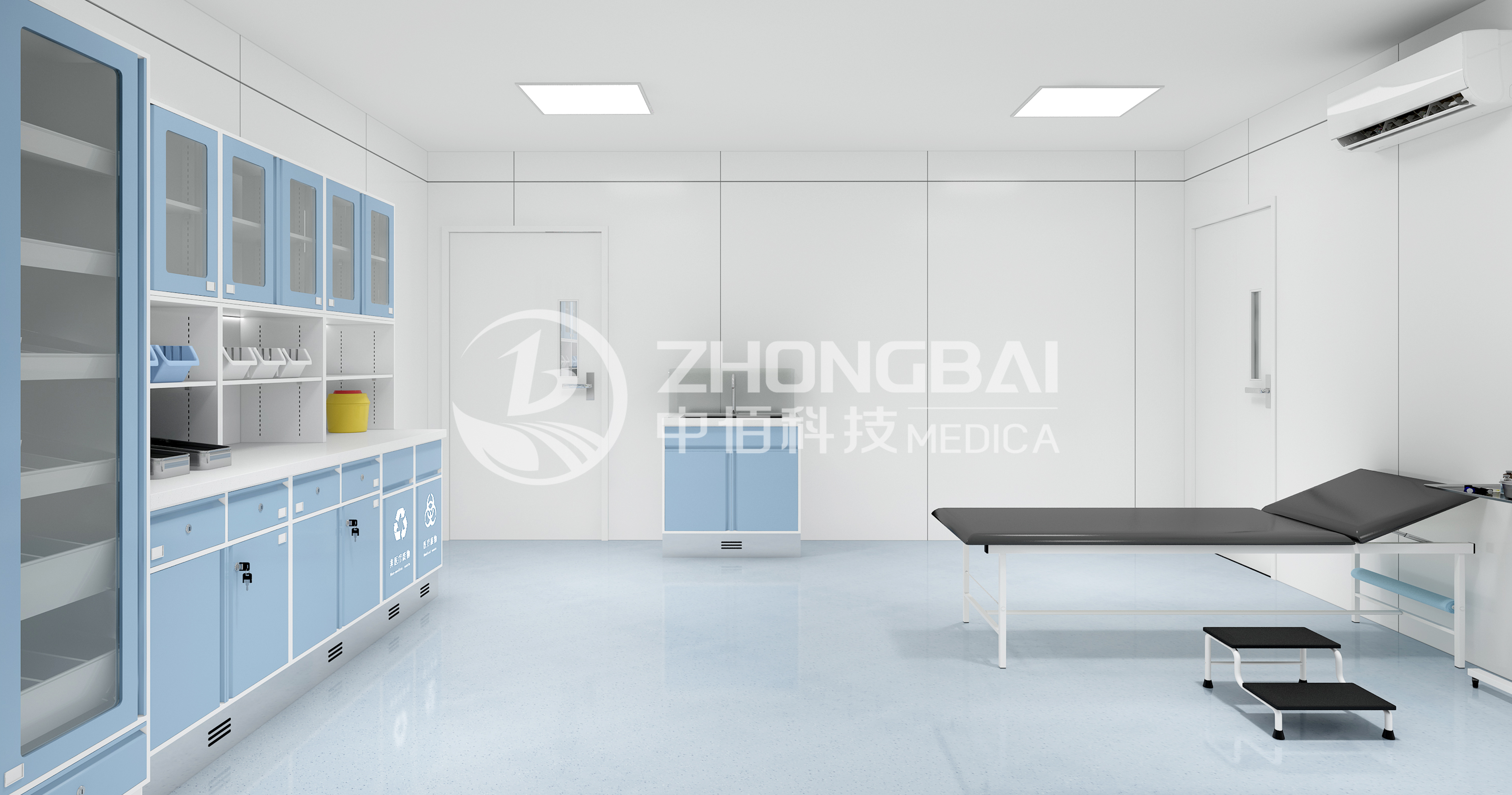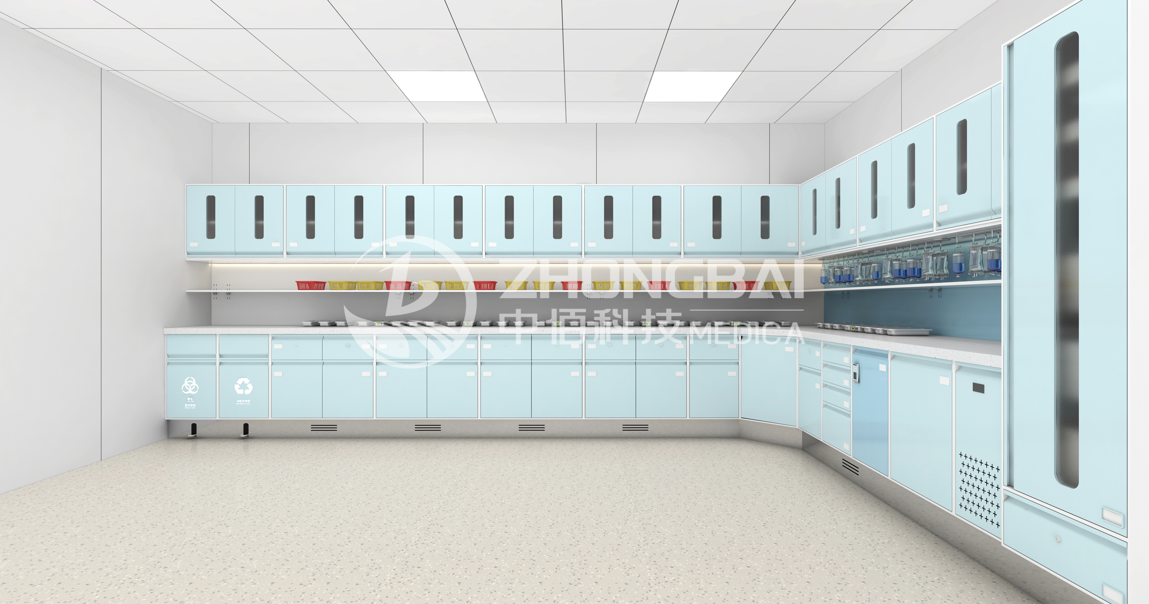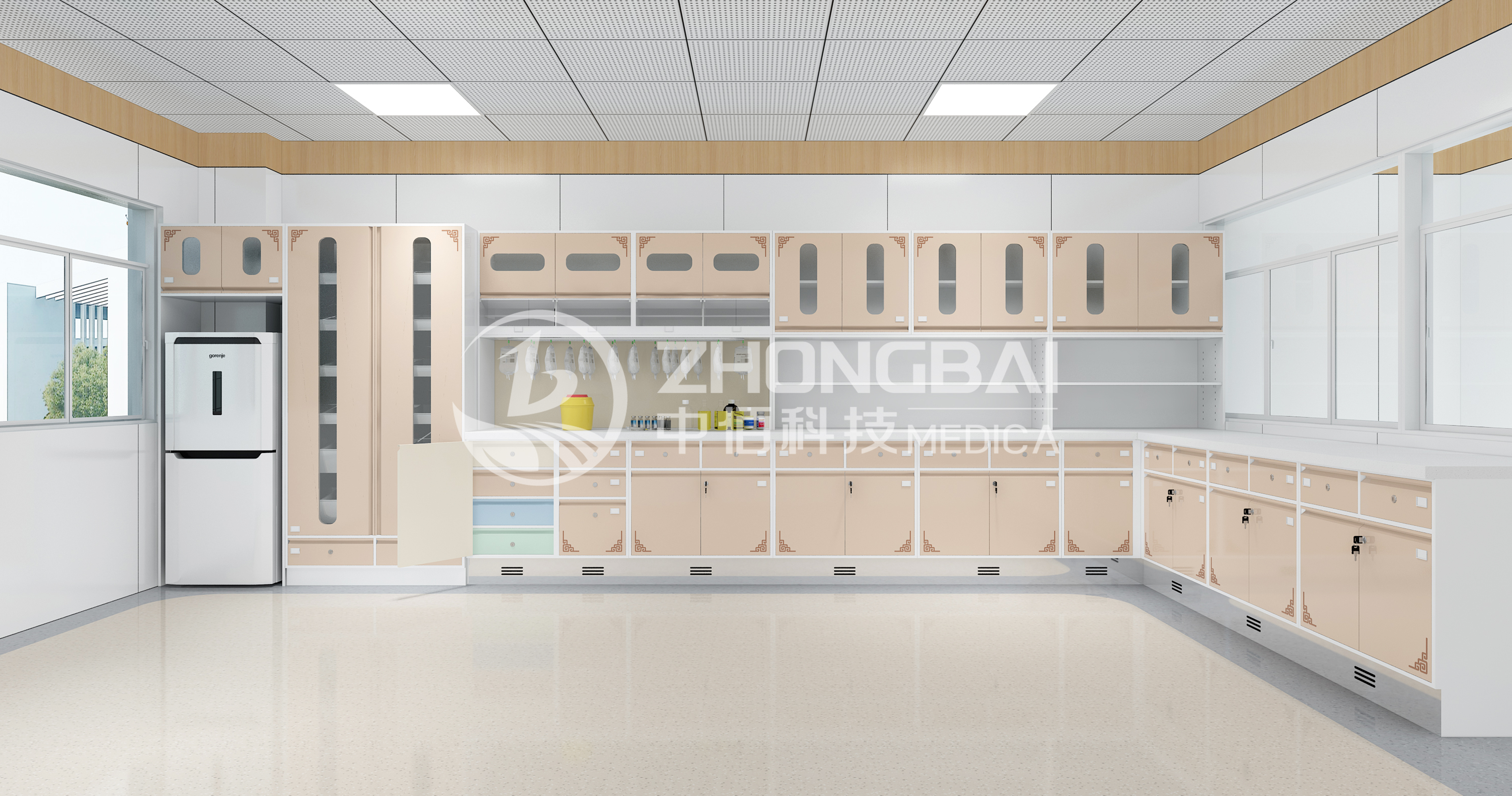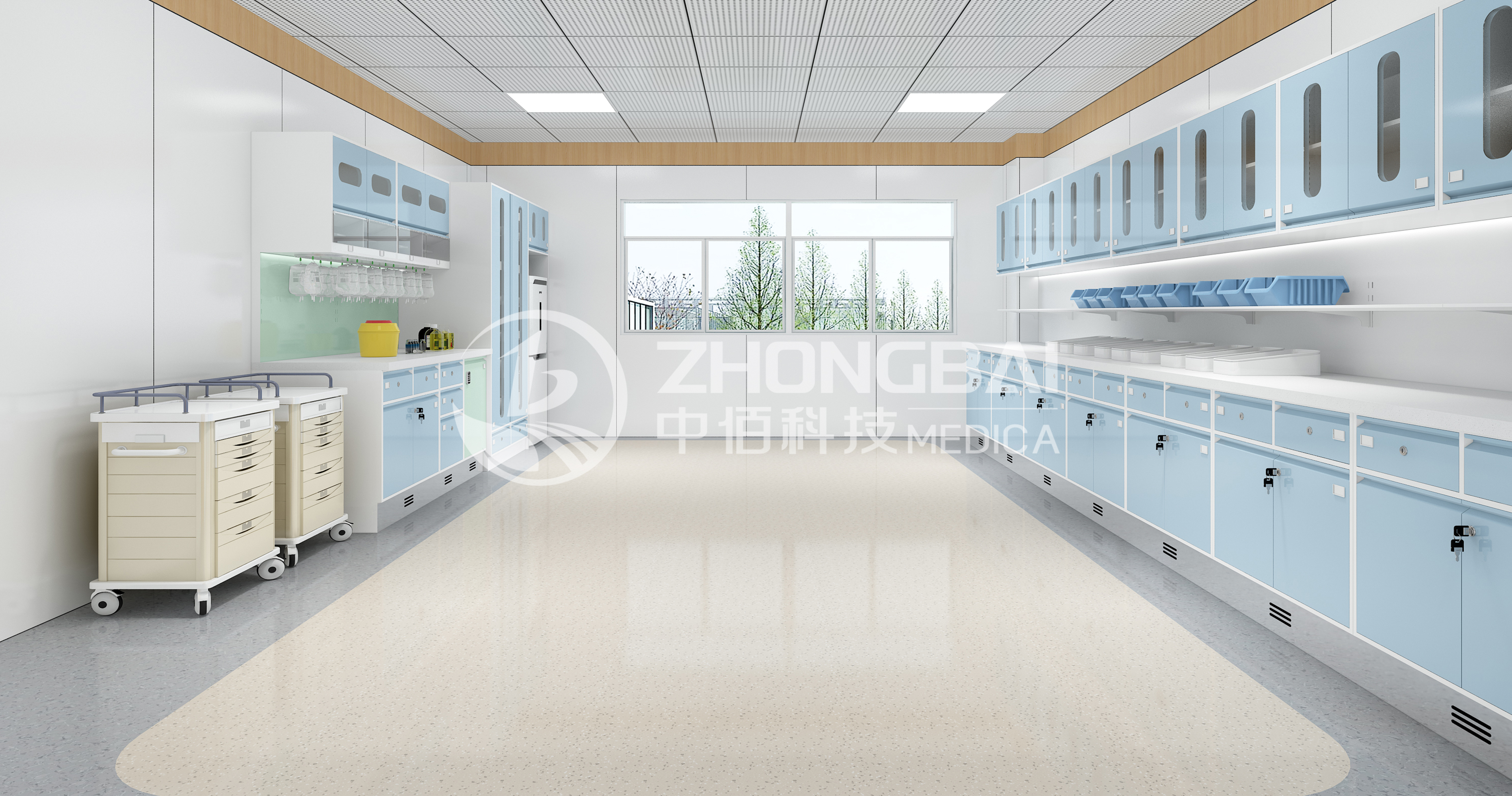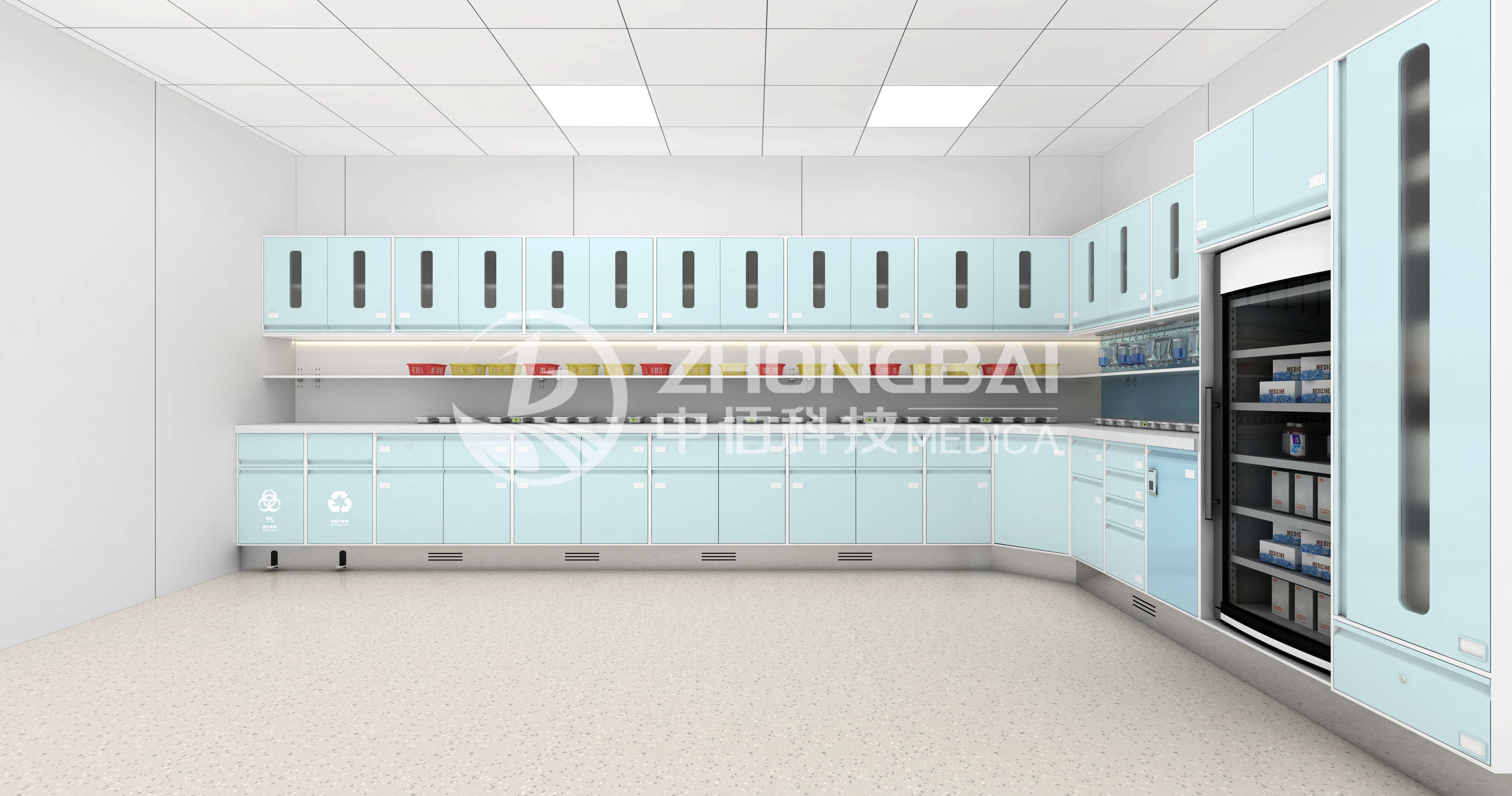 治療室設(shè)在護(hù)士工作站附近,主要為醫(yī)護(hù)人員進(jìn)行治療準(zhǔn)備、藥液配置的專用工作室。室內(nèi)設(shè)有專用操作臺,壁柜、藥柜、發(fā)藥車等,室內(nèi)需潔污分區(qū)管理。