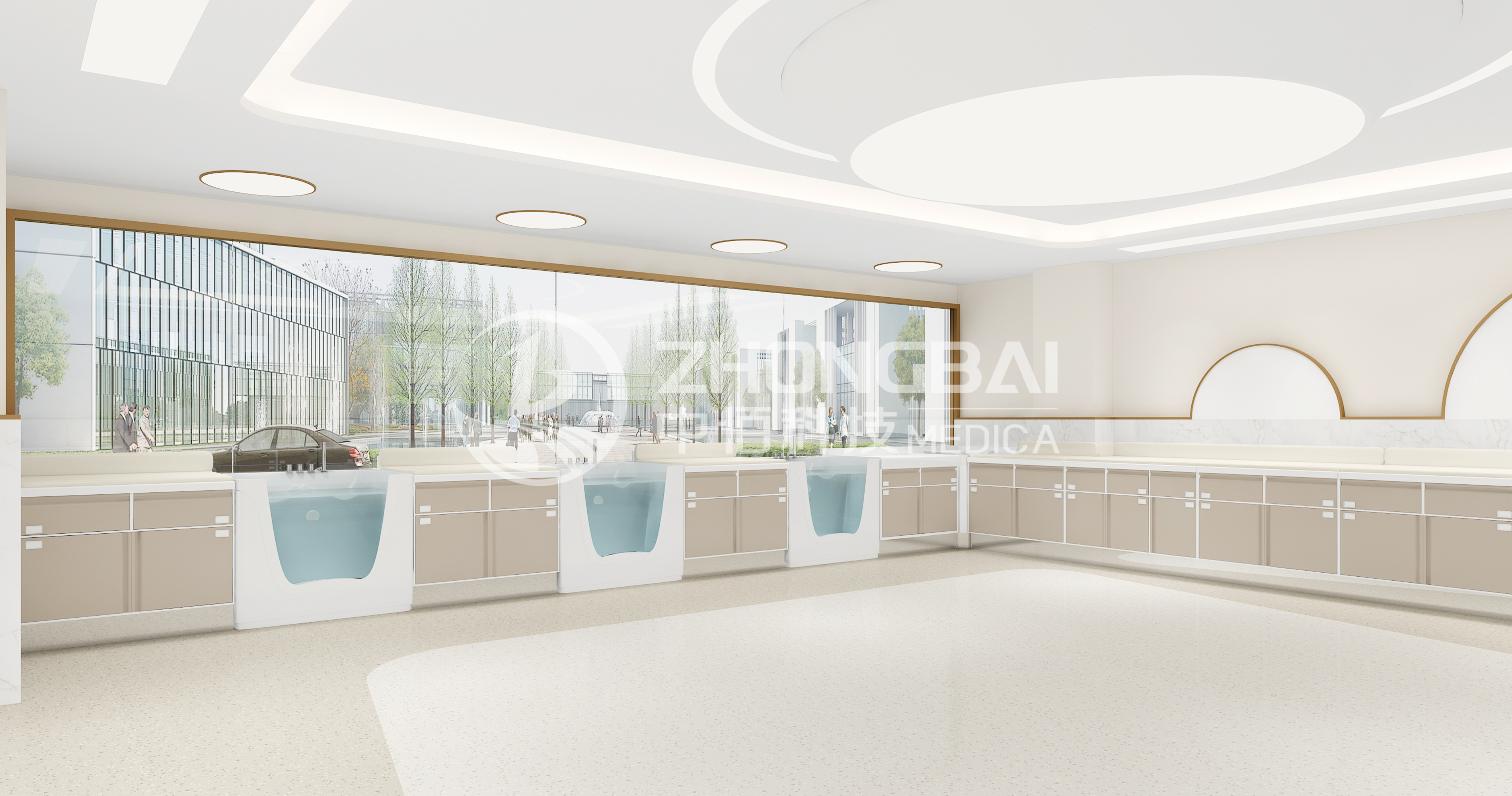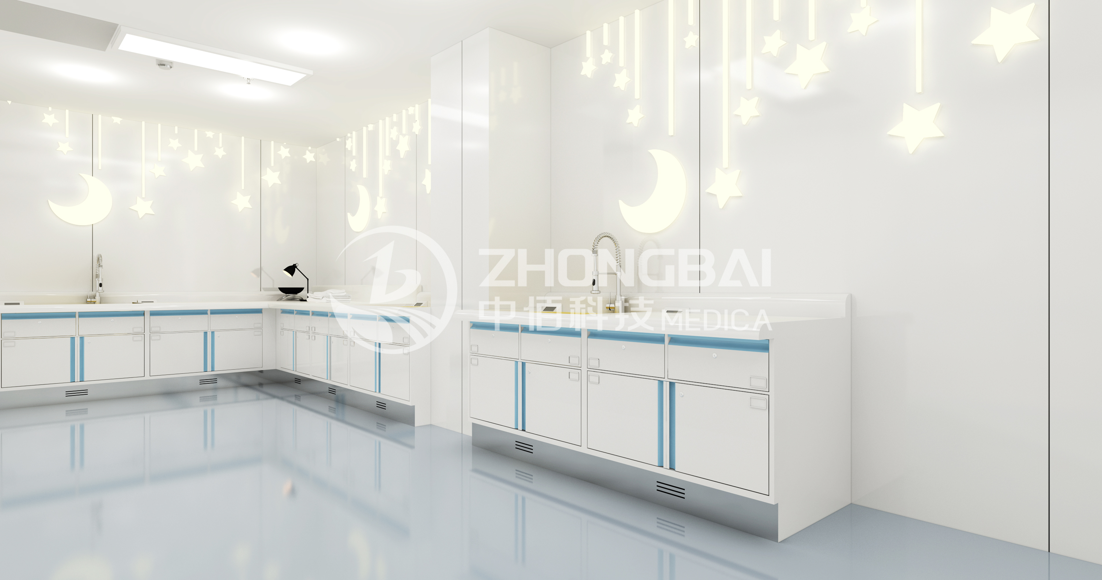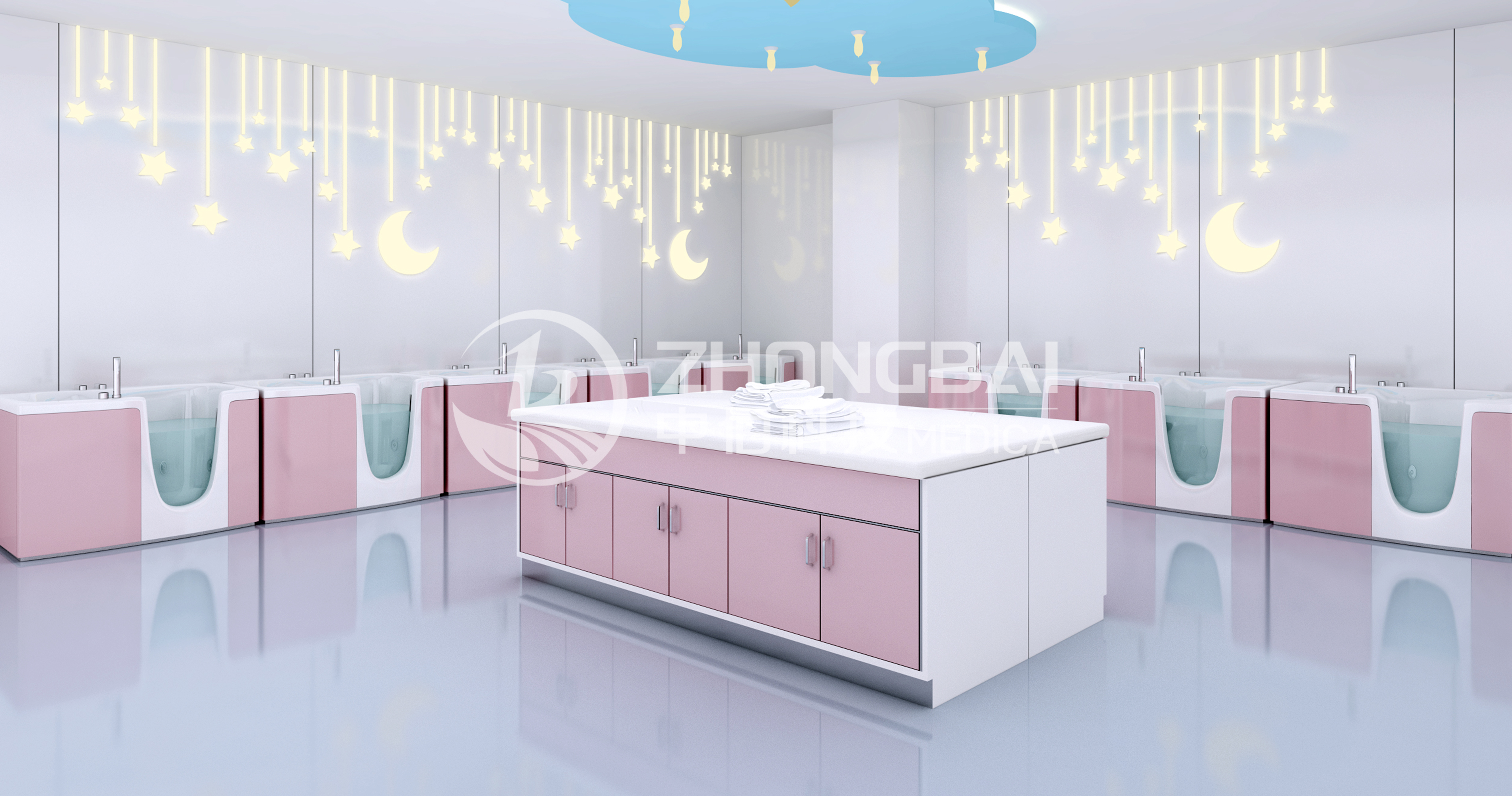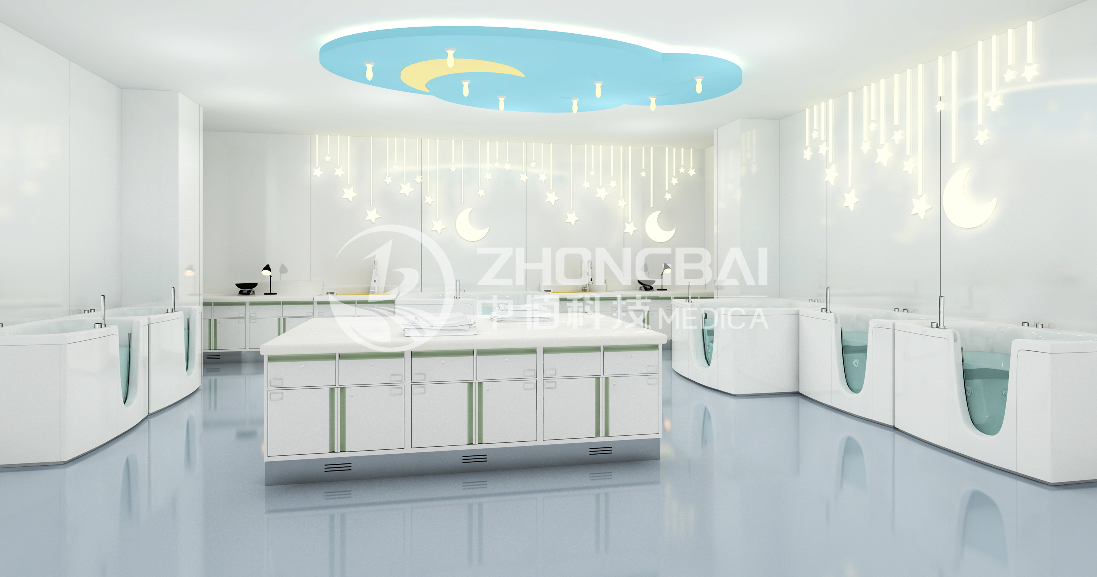 洗嬰室需要結(jié)合新生兒護(hù)理工作的模式和環(huán)境,進(jìn)行整體設(shè)計,注重安全、預(yù)防感染,營造符合嬰幼兒特征的活潑可愛、安全溫馨的場景氛圍。